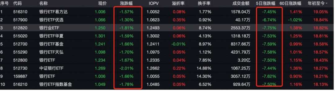 同时,银行ETF也再次领跌市场,10只银行ETF中,最低跌幅也达到了1.3%。尽管银行ETF在年内表现依然抢眼,但资金净流出现象明显,10只银行ETF年内资金净流出近50亿元,而总规模仅为109.48亿元,资金流出占比超过31%。