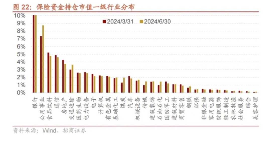 券商研报也支持险资在银行较高配置的主张。招商证券研报显示,截至今年二季度末,险资持仓以银行、公用事业为主,银行持仓市值占比高达44.3%。尽管二季度险资对银行进行了部分减仓,但仍为第一大持仓。