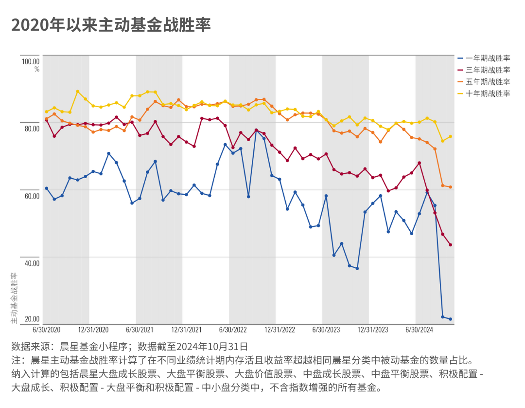 截至2024年10月末,仅有20%的主动基金在过去一年中战胜了同类中的被动基金;在三年的时间维度上,超过一半的主动基金业绩不敌同类被动基金,甚至有部分基金没撑过这三年就清盘了。