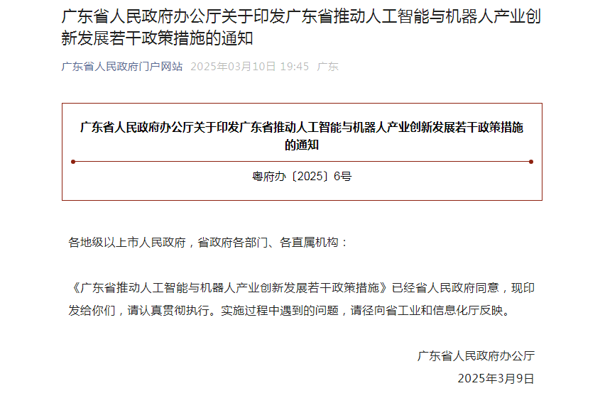 3月10日,广东省人民政府办公厅印发《广东省推动人工智能与机器人产业创新发展若干政策措施》,涵盖支持关键核心技术攻关、培育优质企业、完善创新生态等12条具体举措,旨在整合人工智能与机器人产业链资源,构建全过程创新链。