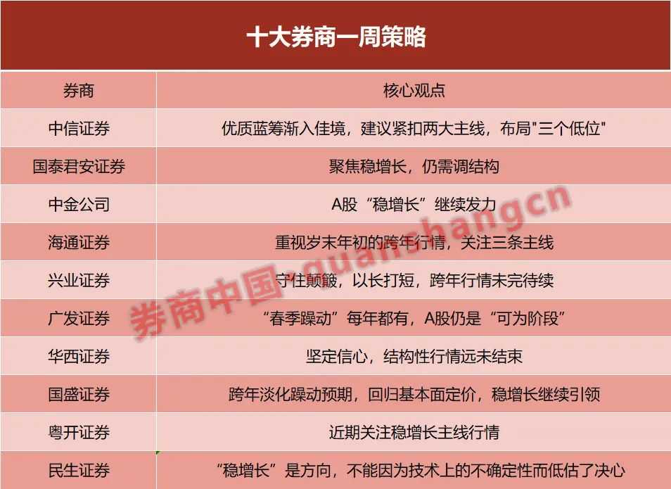 中信证券建议紧扣两大主线,布局“三个低位”,看好优质蓝筹渐入佳境。国泰君安证券聚焦稳增长,认为跨年攻势节奏温和,随着一季度稳增长政策落地,跨年行情将进一步演绎。中金公司则强调“稳增长”政策有望逐步落地,中期看好产业升级等结构性趋势。