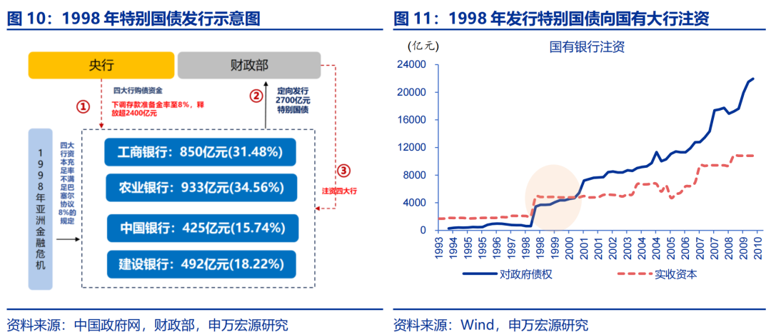 财政加力的方式多样,除了直接加大财政支出力度,还包括与货币政策的协同、化解债务风险、提高转移支付资金效率等。1998年,为缓解国有四大行资本充足率较低等问题,财政部向四大行定向发行2700亿元特别国债,其中超2400亿元源于央行下调存款准备金率释放。而1999年,财政部出资成立四大资产管理公司,剥离四大行及国开行不良贷款,恢复信用扩张功能。