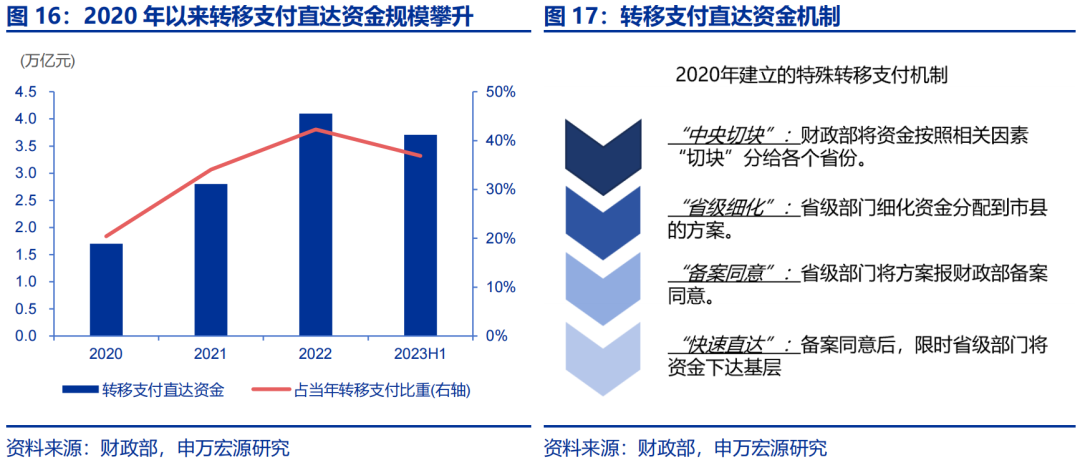 近年来,针对地方隐性债务问题,财政政策持续加码。2023年四季度,全国28省市发行1.39万亿元特殊再融资债用于偿还存量债务。同时,转移支付制度进一步完善,创新直达机制,2022年已有4.1万亿元、占比超40%的转移支付资金直达基层,支撑民生、基建类支出。