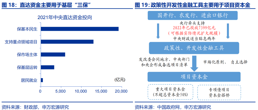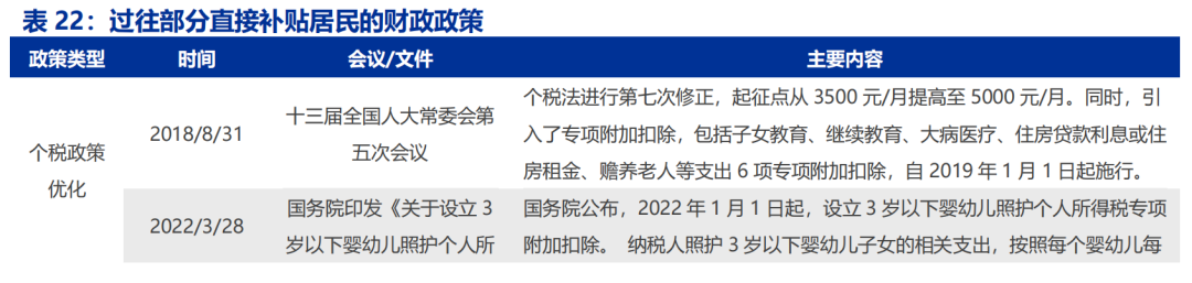增量财力的投向主要集中在地方政府、企业及居民三大主体。地方政府方面,增量财政政策多用于加大基建等领域投资力度,支持“三保”工作。企业方面,财政政策加码主要体现在大规模留抵退税、减税降费、阶段性减免企业社会保险费用等。2022年,新增减税降费及退税缓税缓费超4.2万亿元。居民方面,财政政策直接补贴,包括个税调整优化、社会保障支持补贴、促消费补贴等。2023年,国务院进一步提高个人所得税有关专项附加扣除标准。