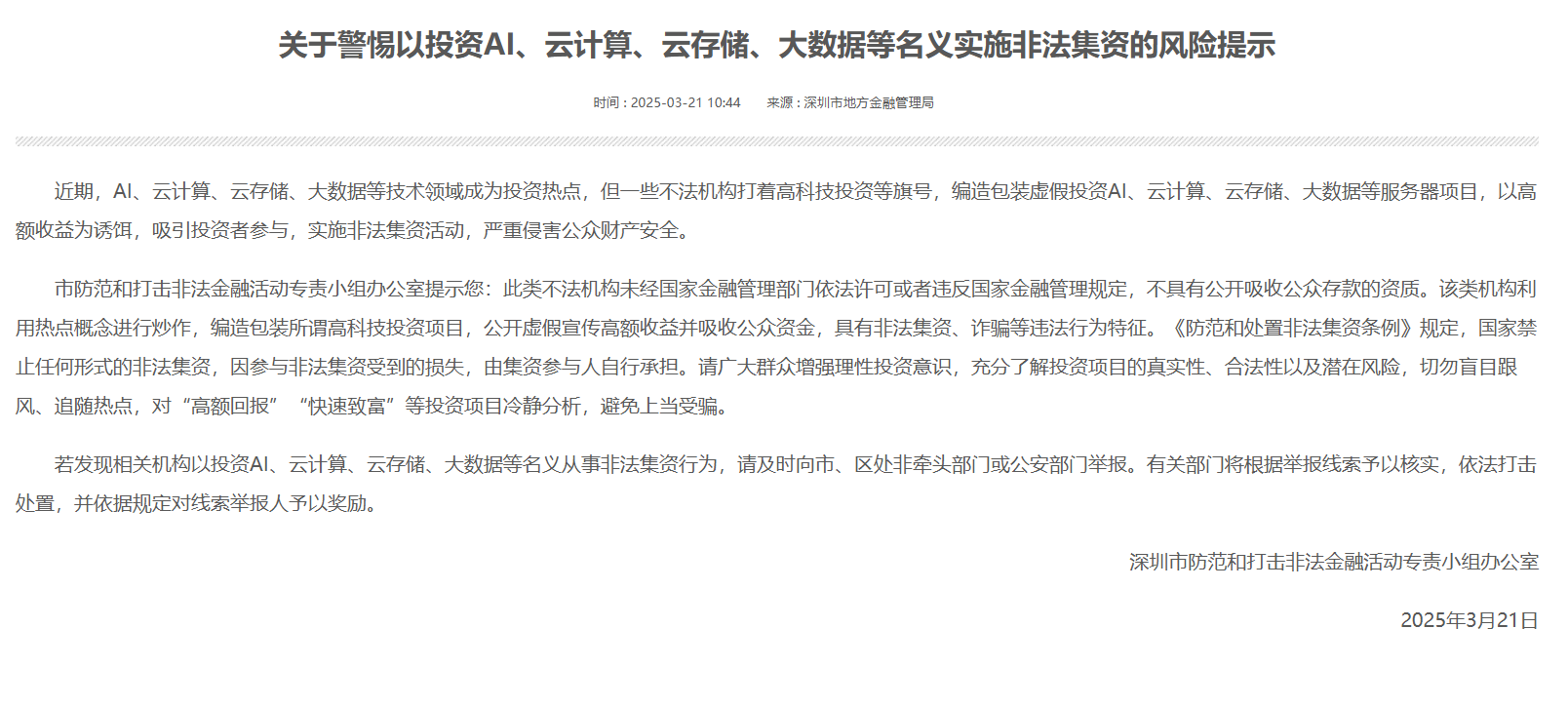 3月21日,深圳市地方金融管理局网站发布《关于警惕以投资AI、云计算、云存储、大数据等名义实施非法集资的风险提示》指出,近期,AI、云计算、云存储、大数据等技术领域备受瞩目,成为投资新热点。然而,一些不法机构利用这些高科技概念,编造虚假投资项目,以高额收益为诱饵,吸引投资者参与非法集资活动,严重威胁公众财产安全。