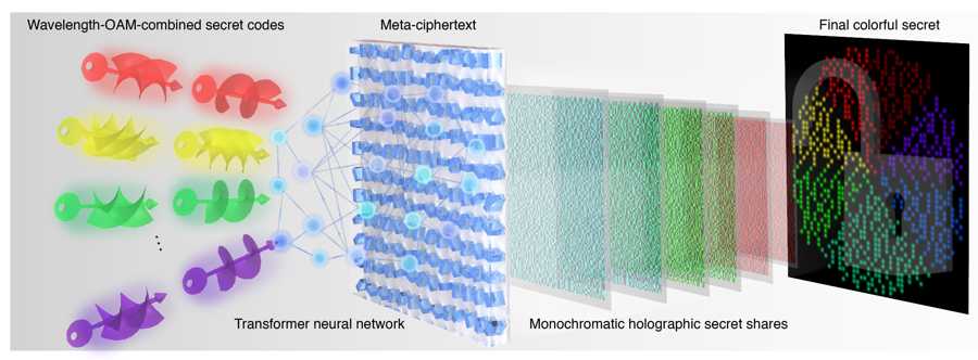 研究团队利用Transformer神经网络,对单张纯相位全息图进行全局优化设计,使其能同时感受入射光波长与轨道角动量的变化,从而承载上百幅图像。这一创新为光波打造了“智能筛网”,实现了2纳米超窄线宽的高精度筛选。