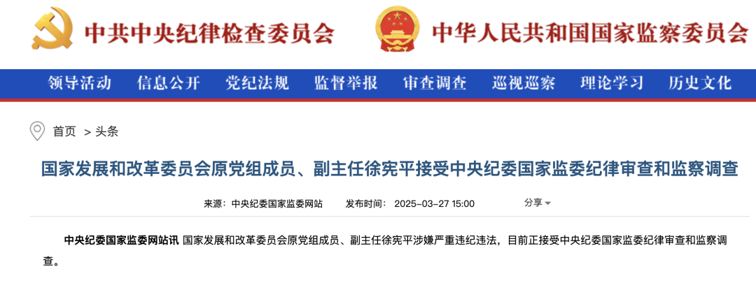 国家发展和改革委员会原党组成员、副主任徐宪平涉嫌严重违纪违法,目前正接受中央纪委国家监委的纪律审查和监察调查。此事件对财经领域产生了重要影响,相关部门将深入调查。