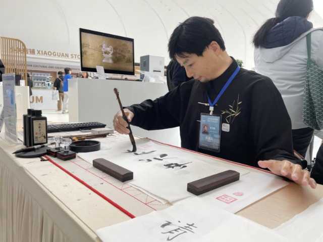 记者见到时,“他”正在书写“中关村”三个大字,书桌旁已放着很多作品。每完成一件后,工作人员会帮“他”换上新纸张。据工作人员介绍,机器人写毛笔字需完成手指、手腕、手肘间的灵活配合,同时,“他”还有微妙表情,时而点头,时而蹙眉。