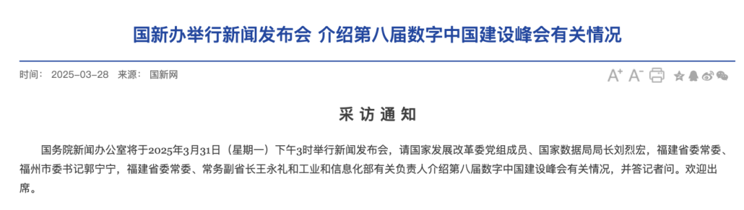 国务院新闻办公室定于2025年3月31日下午3时举办新闻发布会,届时国家发展改革委党组成员、国家数据局局长刘烈宏,福建省委常委、福州市委书记郭宁宁,福建省委常委、常务副省长王永礼及工业和信息化部相关负责人将出席,详细介绍第八届数字中国建设峰会的筹备情况及亮点内容,并就媒体关心的热点问题进行现场解答。
