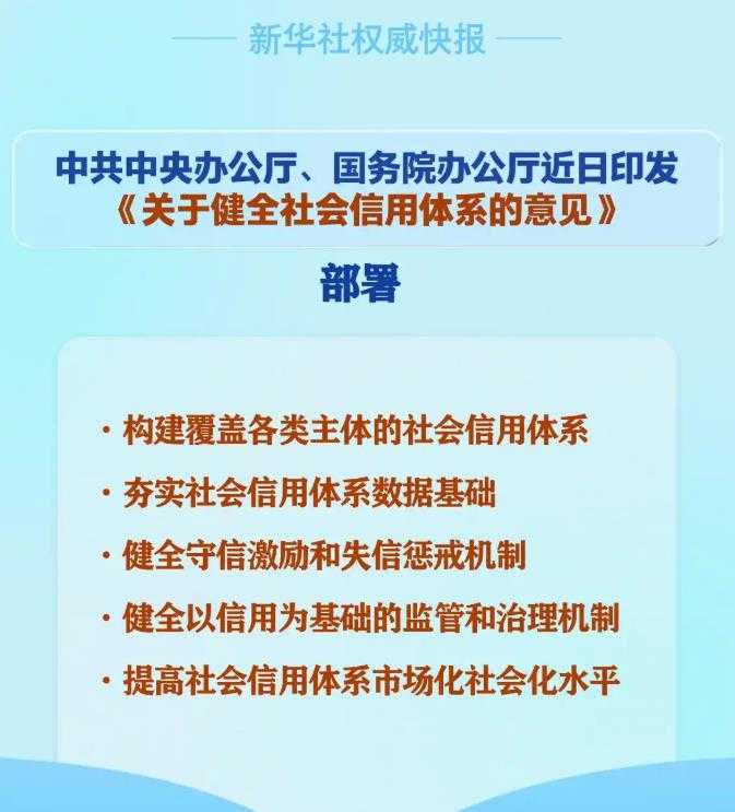 为进一步完善社会信用体系,中共中央办公厅、国务院办公厅近期联合发布了《关于健全社会信用体系的意见》,旨在全面提升社会信用体系的效能。
