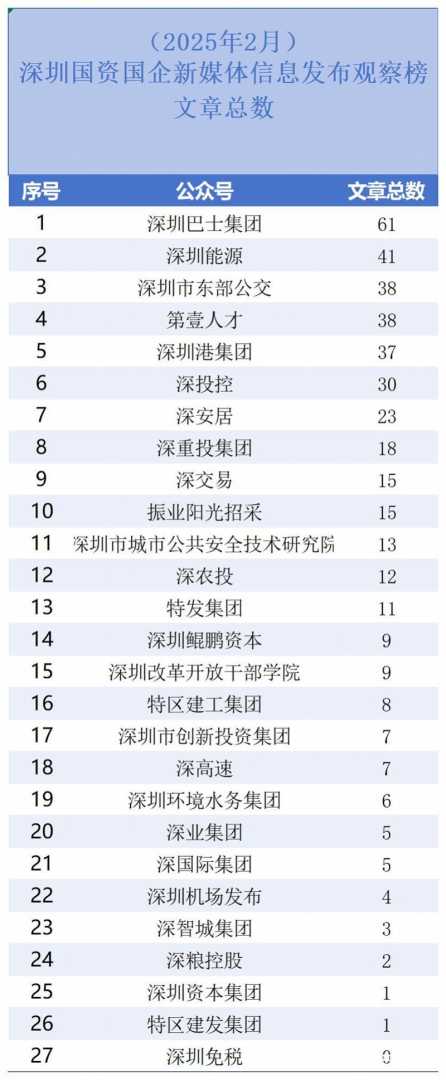 2025年2月深圳国资国企系统微信公众号运营数据显示,上榜账号整体发文量下降。45个账号发文量环比下降,其中深交易账号运营调整显著,单月推文量减少25篇,降幅最大。在文章总数上,深圳巴士集团发文61篇,位居国企一级账号榜单第一;深圳能源(41篇)位居第二,深圳市东部公交(38篇)位居第三。