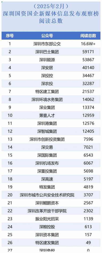 从2022年第一季度起,南都·湾财社开始对深圳市属国有企业及深圳国资控股或参股的上市公司新媒体信息发布情况进行测评,推出“深圳国资国企新媒体信息发布观察榜”,旨在通过阅读量等指标观察账号影响力,提炼和分析优秀传播案例,总结运营和传播经验,推动深圳国资国企新媒体发展。本月,我们发布了“2025年2月深圳国资国企新媒体信息发布观察榜”(简称“深圳国资新媒体信息观察榜”),测评对象包括27个深圳国企一级账号和23个深圳国资控股或参股的上市公司微信公众号,合计50个账号。