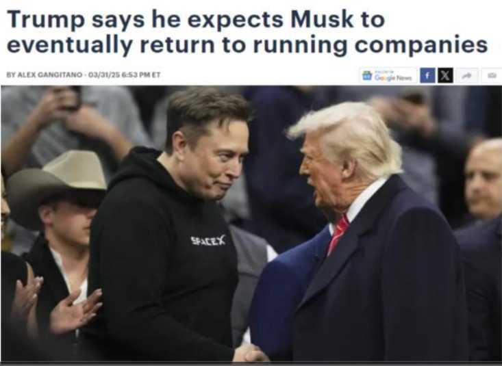 据中国新闻网援引美国《国会山报》报道,当地时间3月31日,美国总统特朗普表示,他预计美国政府效率部门负责人马斯克在完成联邦政府改革任务后,最终会重返经营自己的公司。