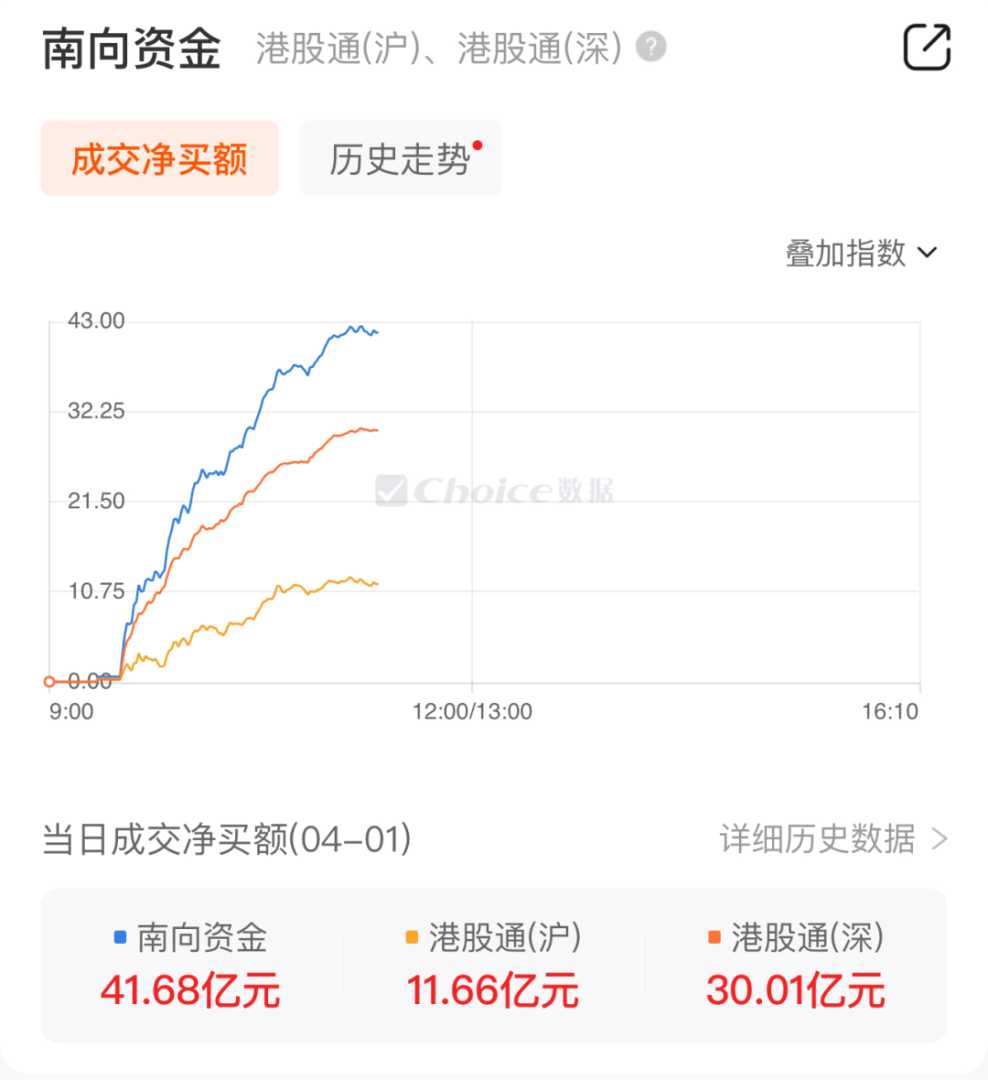 4月1日11时21分,南向资金净买入额达到41.68亿港元,显示出资金对港股市场的积极态度。数据来源Choice金融终端,为投资者提供了准确的市场信息。