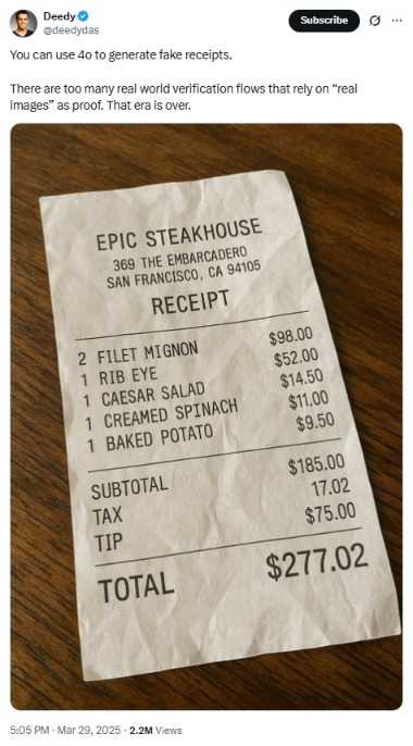 风险投资家Deedy Das在社交媒体上发帖,展示了他利用ChatGPT制作的一张牛排馆假收据照片,并发出警告,现实中许多场合依赖照片验证,但游戏规则已悄然改变。