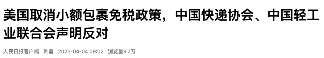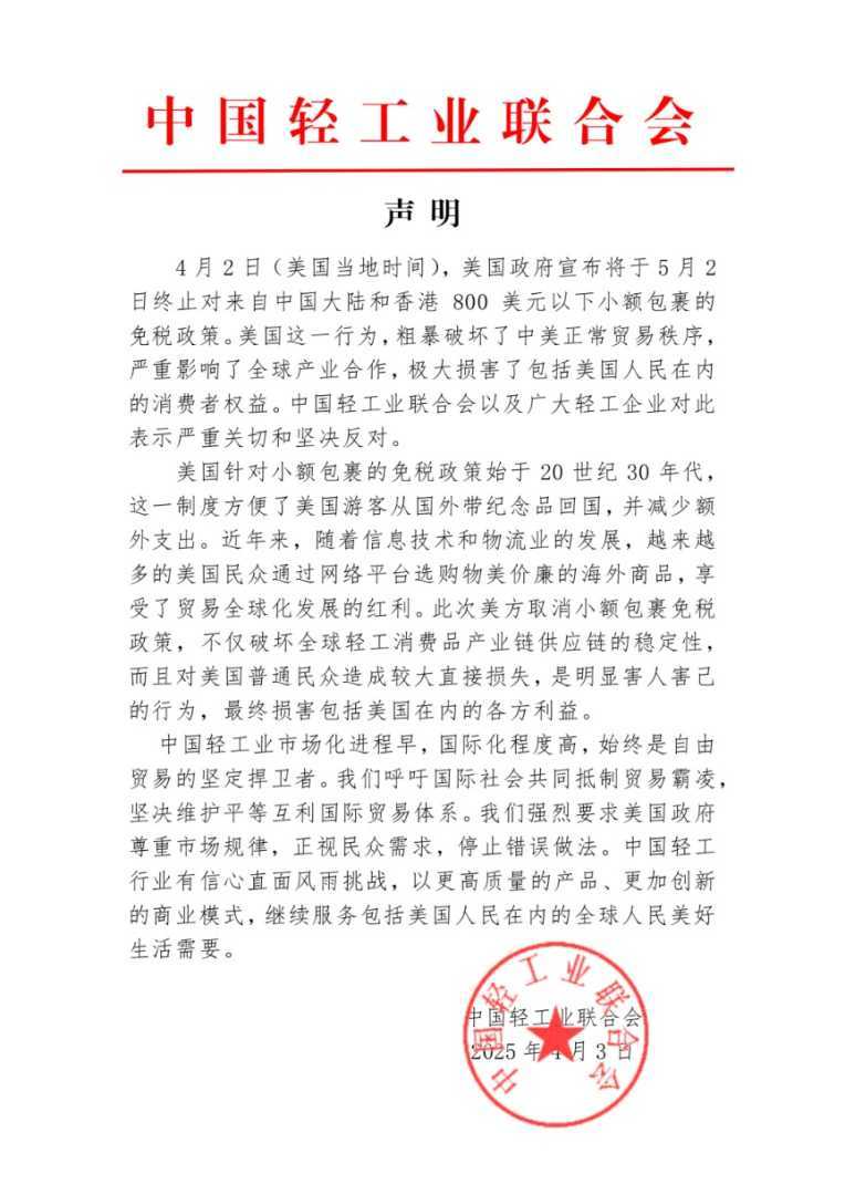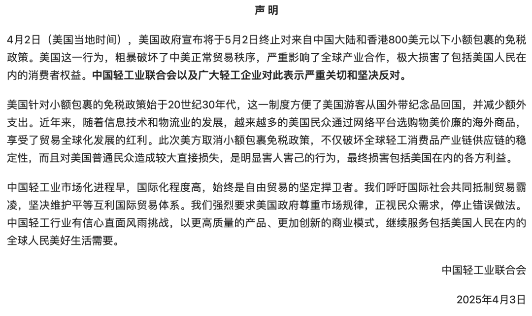 4月3日,中国快递协会、中国纺织工业联合会分别发布声明,对美国取消800美金以下“小包免税”政策表示坚决反对。此举将对跨境电商和国际寄递行业产生深远影响。