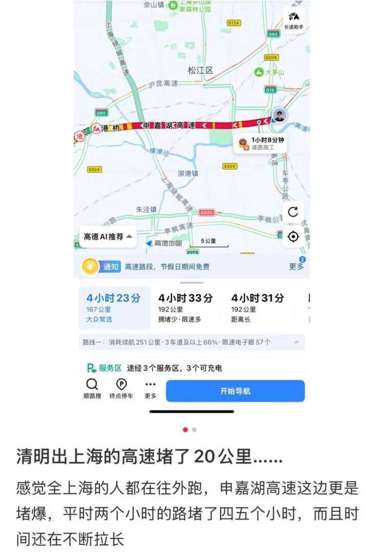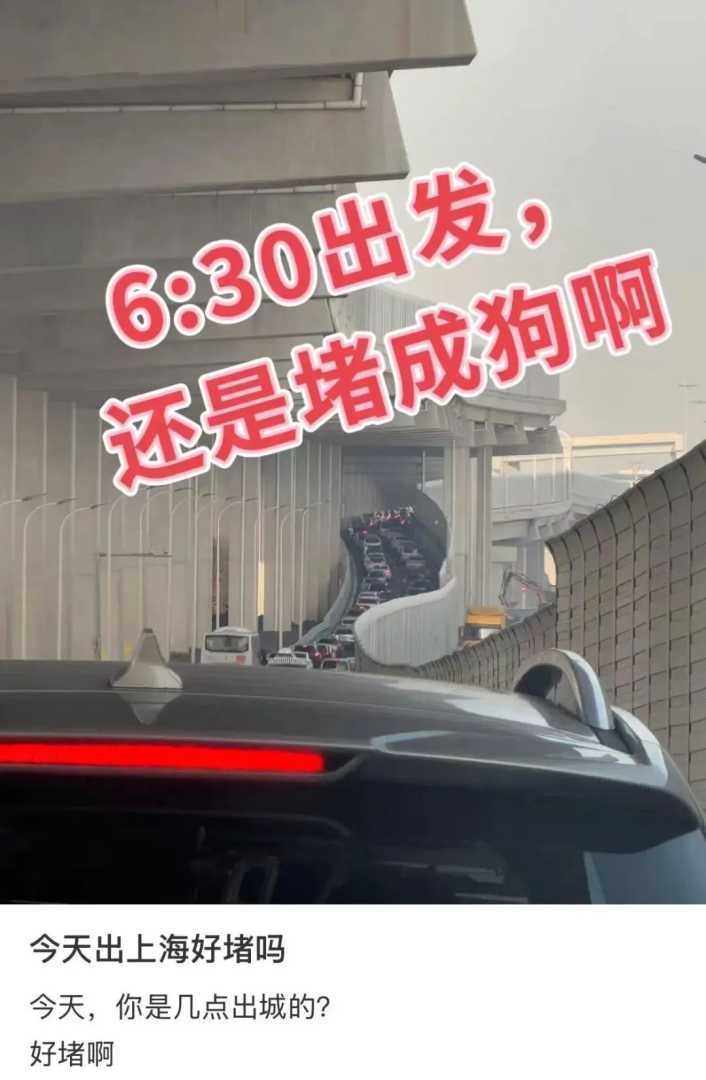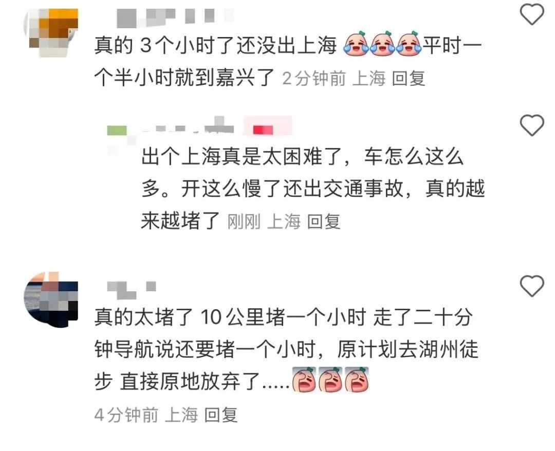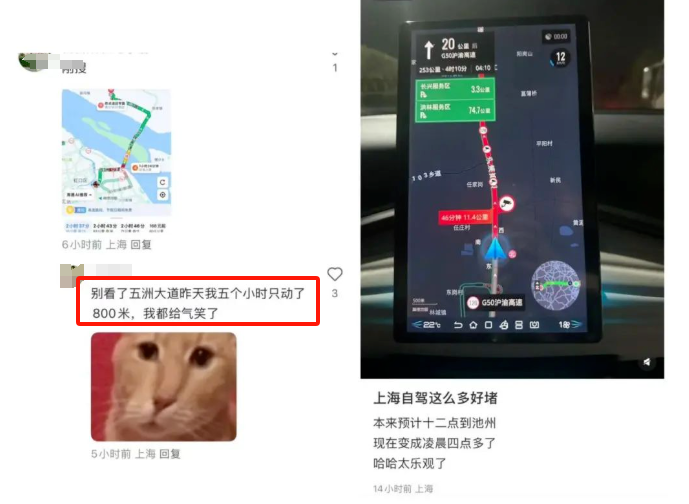 网络上,有上海网友表示机智地半夜出发,结果仍遭遇大堵车,平时2小时的路走了四五个小时,有人甚至“5个小时只动了800米,气笑了”。