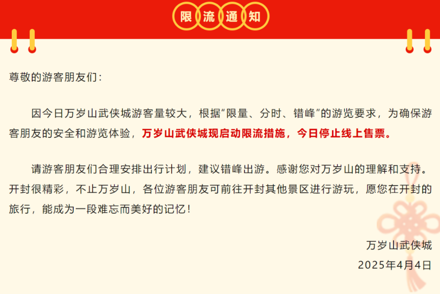 多家热门景区已启动限流措施,龙门石窟、万岁山武侠城、河南宝泉旅游区、长沙橘子洲景区等均表示门票已约满。