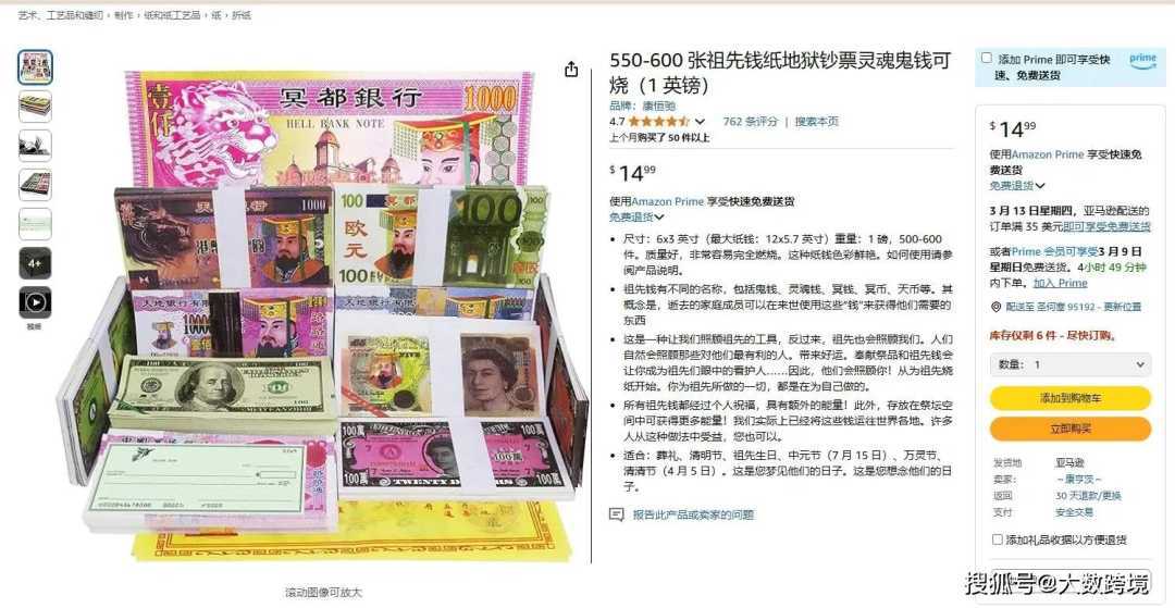 美国亚马逊上售卖的冥币图源:亚马逊官网