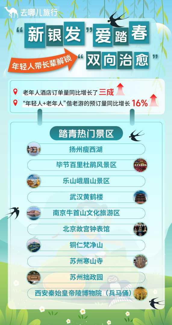 去哪儿数据显示,清明假期偕老游预订量同比增长16%,带来消费增量,体现家庭旅游中的情感交流。同时,“拼假族”长线赏花踏青也呈现亮点,如泰山、黄山人气暴增,海外日本赏樱目的地酒店预订热度同比增长超120%。