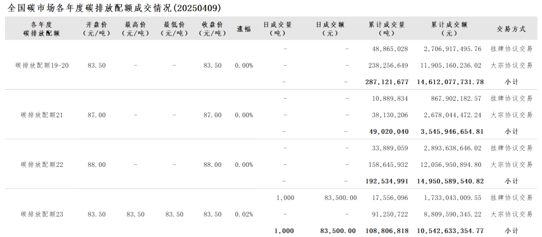 4月9日全国碳市场价格保持稳定,开盘价、最高价、最低价及收盘价均为85.50元/吨。截至2025年4月9日,全国碳市场碳排放配额累计成交量637,483,526吨,累计成交额突破43651亿元。