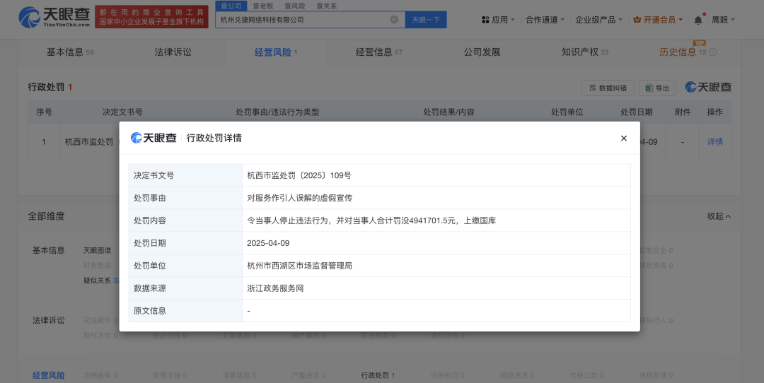 据天眼查天眼风险信息显示,杭州市西湖区市场监督管理局对这三家公司分别处以罚没494万余元、328万余元、154万余元的处罚。