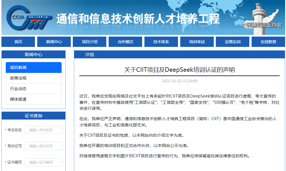 CIIT项目是中国通信工业协会的人才培养项目,与工信部无关。协会已发布声明澄清。