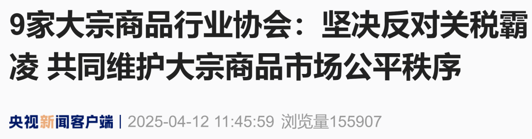 4月12日,据央视新闻报道,中国物流与采购联合会大宗商品流通分会携手中国物资储运协会、中国物资再生协会、中国金属材料流通协会、中国化工流通协会、中国机电产品流通协会、中国木材与木制品流通协会、中国汽车流通协会和中国农业机械流通协会,共同发布了《关于应对美国霸凌关税维护大宗商品市场和产业链供应链稳定的倡议》。此倡议代表中国大宗商品流通行业,坚决反对美国政府的贸易保护主义行为,坚决支持中国政府为维护国家利益和全球大宗商品经贸秩序所采取的一切应对措施。
