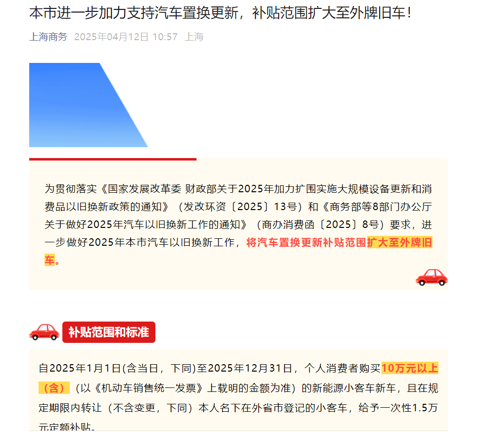 4月12日,上海市商务委发布消息称,为进一步做好2025年上海汽车以旧换新工作,积极响应国家促进汽车消费政策,将汽车置换更新补贴范围扩大至外牌旧车,此举旨在推动汽车市场繁荣,促进新能源汽车普及。