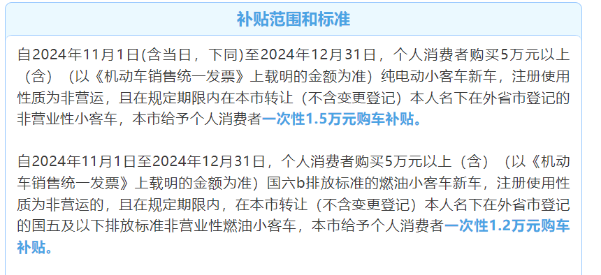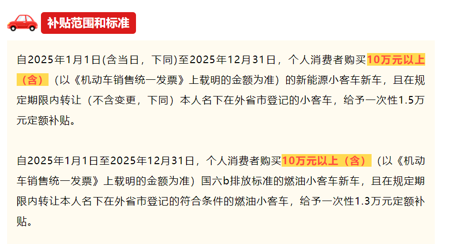 上海最新发文指出,自2025年1月1日至2025年12月31日,个人消费者购买10万元以上(含)(以《机动车销售统一发票》上载明的金额为准)的新能源小客车新车,且在规定期限内转让本人名下在外省市登记的小客车,将给予一次性1.5万元定额补贴。同时,购买国六b排放标准的燃油小客车新车也可享受1.3万元定额补贴。