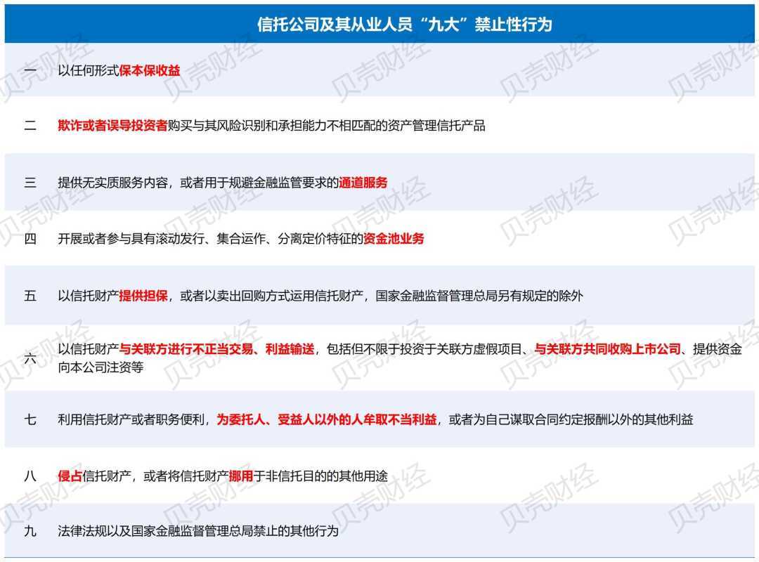 值得注意的是,《办法》将信托公司的注册资本最低限额从3亿元上调至5亿元,并强化了资本和拨备管理,同时明确列出了信托公司及其从业人员的九大禁止性行为。