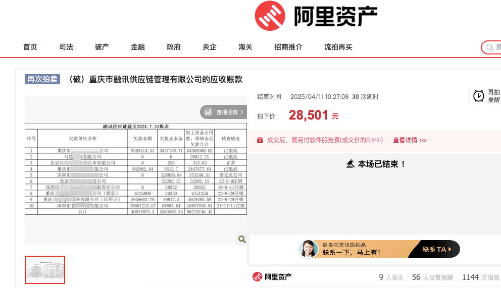 应收账款拍卖、融讯供应链、破产清算、市场关注