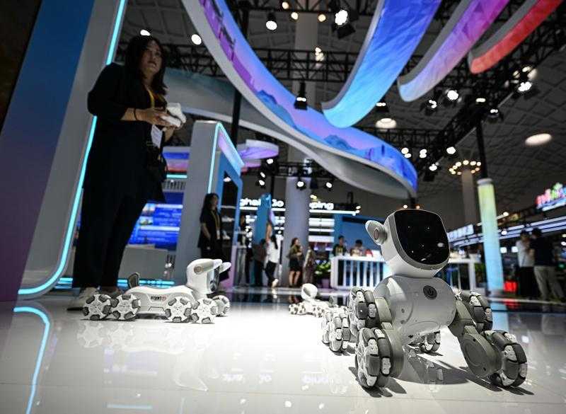 4月13日,工作人员在第五届消博会北京展区进行遥控机器狗玩具演示,吸引了众多观众驻足观看。