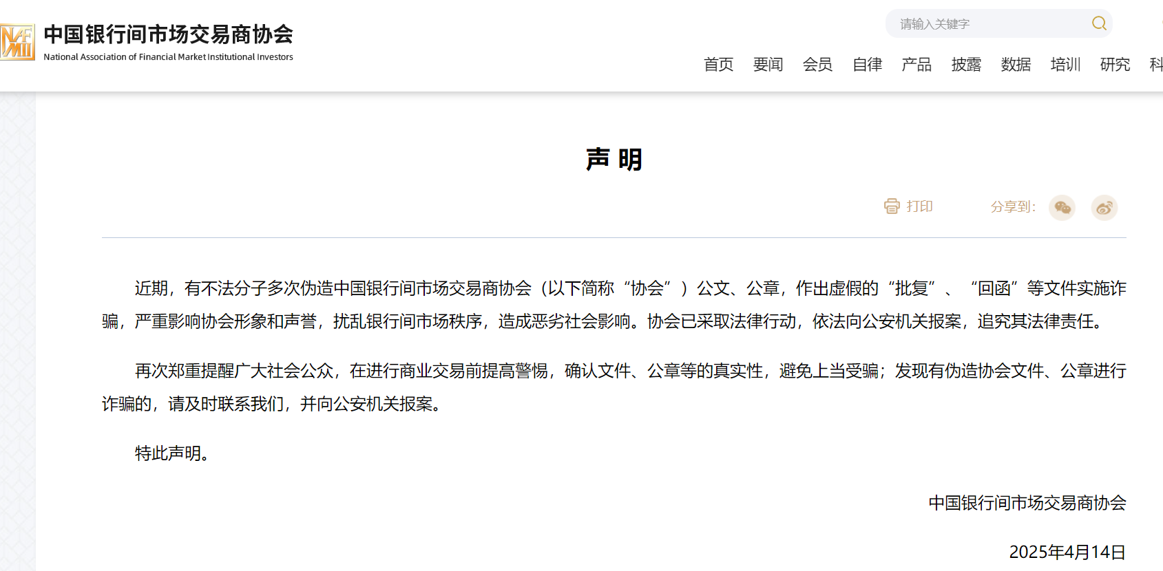 上证报中国证券网讯 中国银行间市场交易商协会4月14日正式发布声明,近期,市场上出现多起不法分子伪造中国银行间市场交易商协会(简称“协会”)公文、公章的诈骗案件。这些不法分子通过虚假的“批复”“回函”等文件实施诈骗,不仅严重损害了协会的形象和声誉,更扰乱了银行间市场的正常秩序,产生了极其恶劣的社会影响。对此,协会已经果断采取法律行动,依法向公安机关报案,誓将不法分子绳之以法,追究其法律责任。