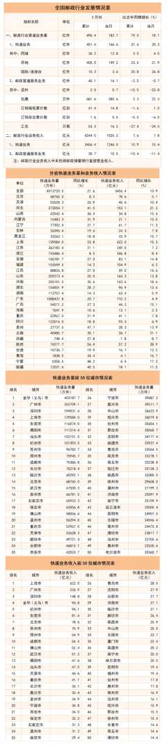 一季度,我国邮政行业业务收入(不包括邮政储蓄银行直接营业收入)累计完成4244亿元,同比增长7.6%。其中,快递业务收入累计完成3456.4亿元,同比增长10.9%。快递业务成为收入增长的重要来源。