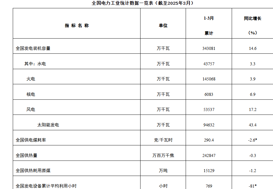 国家能源局发布1-3月电力工业数据,太阳能发电装机容量大增