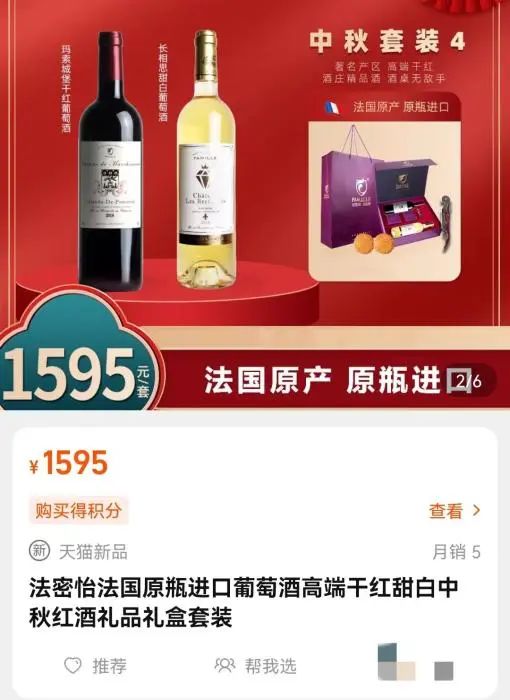 此外,打着“中秋礼盒”等旗号的商品中,也常包含月饼,且售价往往超过500元。例如,在某红酒品牌旗舰店中,一款售价1595元的中秋套装里包含了两瓶酒、两盒月饼和一把多功能开瓶器。但记者查询发现,两瓶酒的合计售价仅为710元,这意味着刨除两瓶酒,月饼等其他商品的价值超过800元。