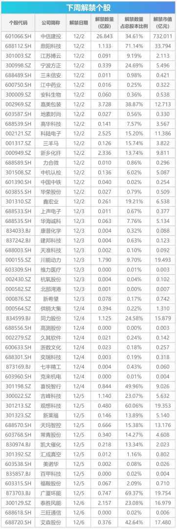 据统计,下周(12月2日至6日)A股市场将迎来51家上市公司的限售股解禁高峰。按11月29日收盘价计算,解禁总市值高达987.86亿元。其中,中信建投解禁市值居首位,达到732.01亿元,鼎阳科技与广厦环能则分别以33.79亿元和19.75亿元紧随其后。从解禁股数来看,中信建投以26.84亿股遥遥领先,嘉美包装和科陆电子分别以3.73亿股和2.52亿股位列二、三位。