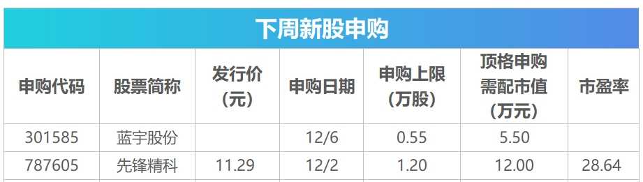 下周新股发行市场将迎来两只新股的发行。具体来看,先锋精科将于12月2日正式发行,而蓝宇股份则定于12月6日发行。这两只新股的发行将为投资者带来新的投资机会。