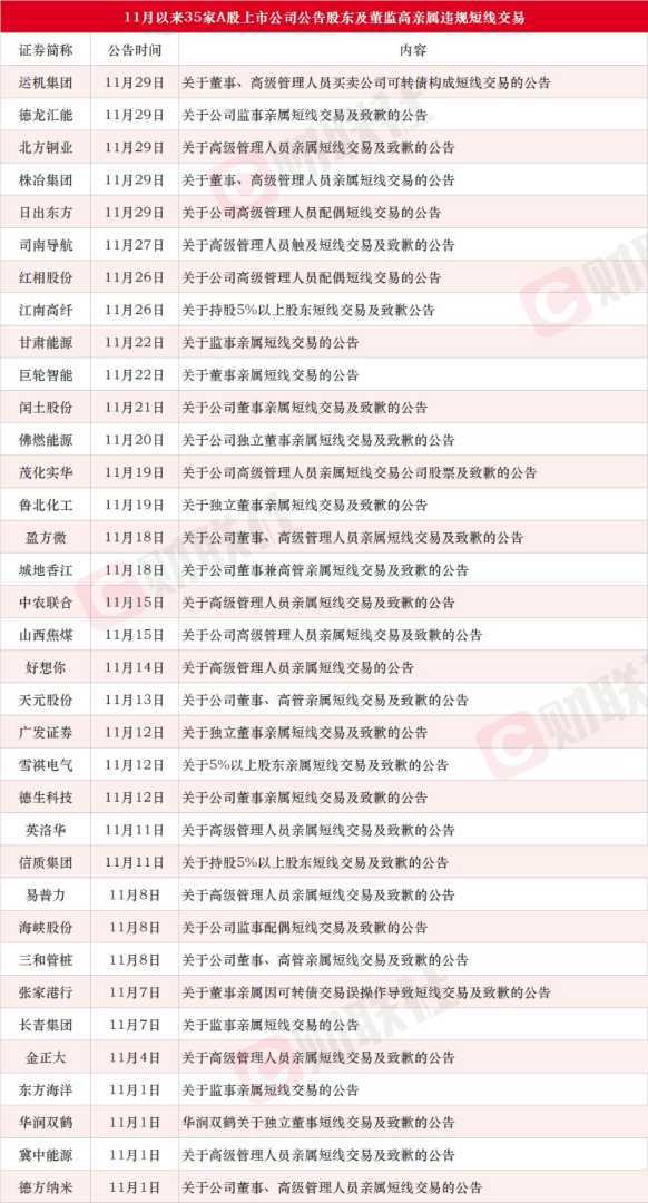 11月以来,A股市场多家上市公司公告其股东及董监高亲属涉嫌违规短线交易,涉及35家公司,其中27家实现盈利,股价表现强劲。