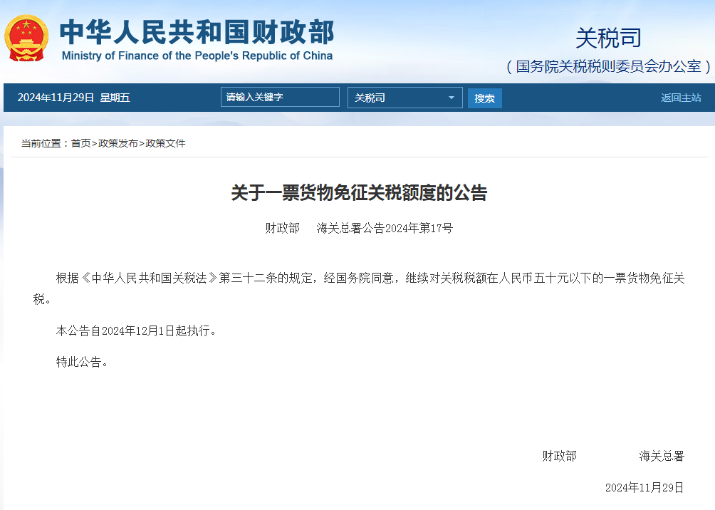 财政部与海关总署联合发布2024年第17号公告,决定继续对关税税额在人民币五十元以下的一票货物免征关税,旨在减轻小微企业和个体工商户税收负担,促进国内贸易发展。