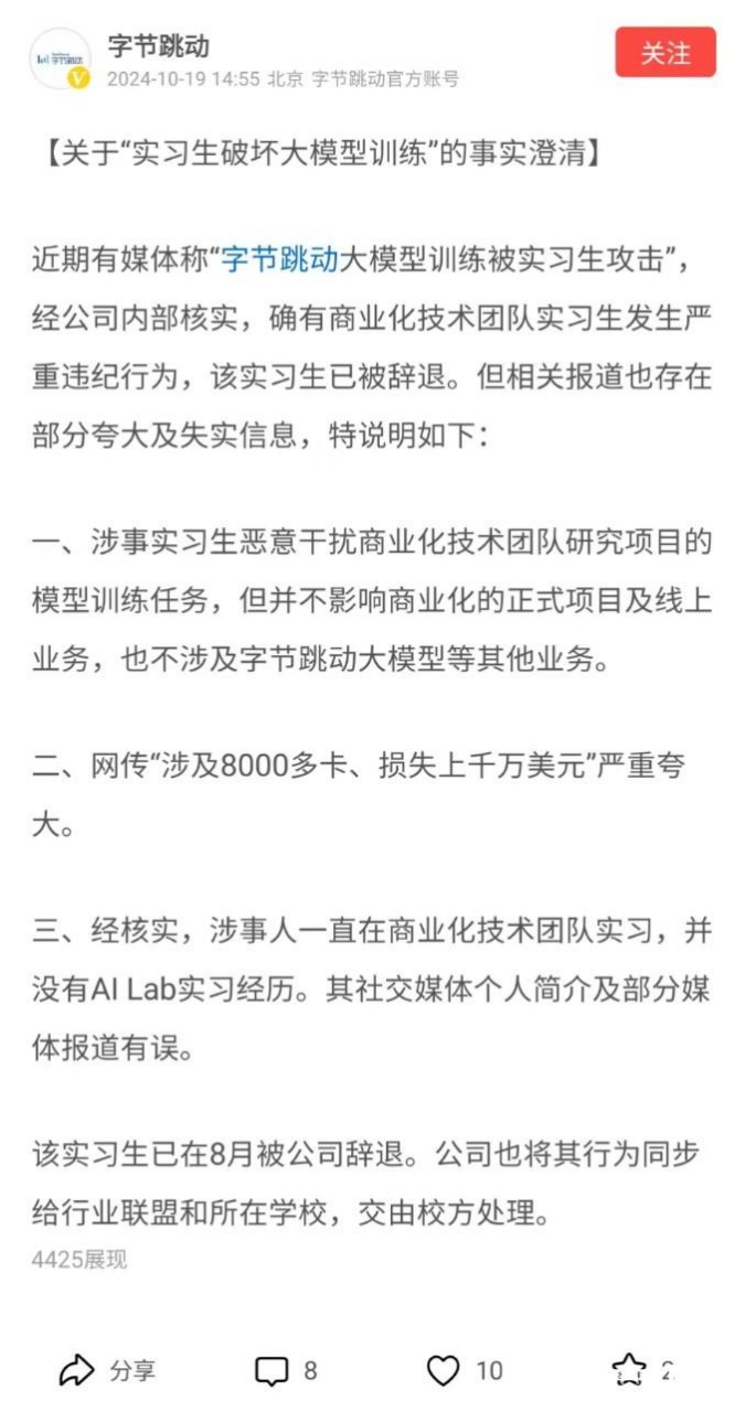 针对此前有媒体报道称“字节大模型训练任务被实习生攻击”,并传出“涉及8000多卡、损失上千万美元”的谣言,字节跳动官方账号已发布澄清公告,确认确有实习生严重违纪并被辞退,但相关报道存在夸大及失实信息。涉事行为仅干扰了商业化技术团队某研究项目的模型训练任务,未影响公司正式项目及线上业务,更不涉及字节跳动大模型等其他业务。