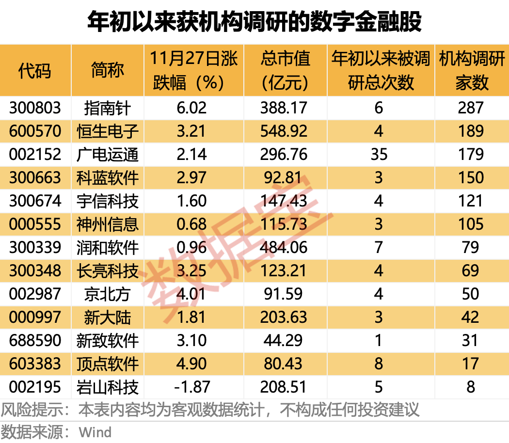 同时,部分数字金融概念股受到了机构的密切关注。据统计,今年以来已有13只数字金融股获得机构调研。其中,指南针以累计获得287家机构调研位居榜首;恒生电子、广电运通及科蓝软件等均获得超过150家机构的调研。