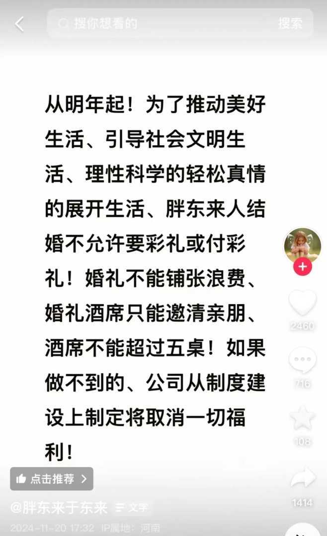于东来,胖东来商贸集团的创始人,近日在个人社交平台的一系列发言引发了广泛关注。他宣布,从明年起,胖东来员工结婚将不允许索要或支付彩礼,婚礼需保持简朴,酒席仅限亲朋好友,且不得超过五桌。