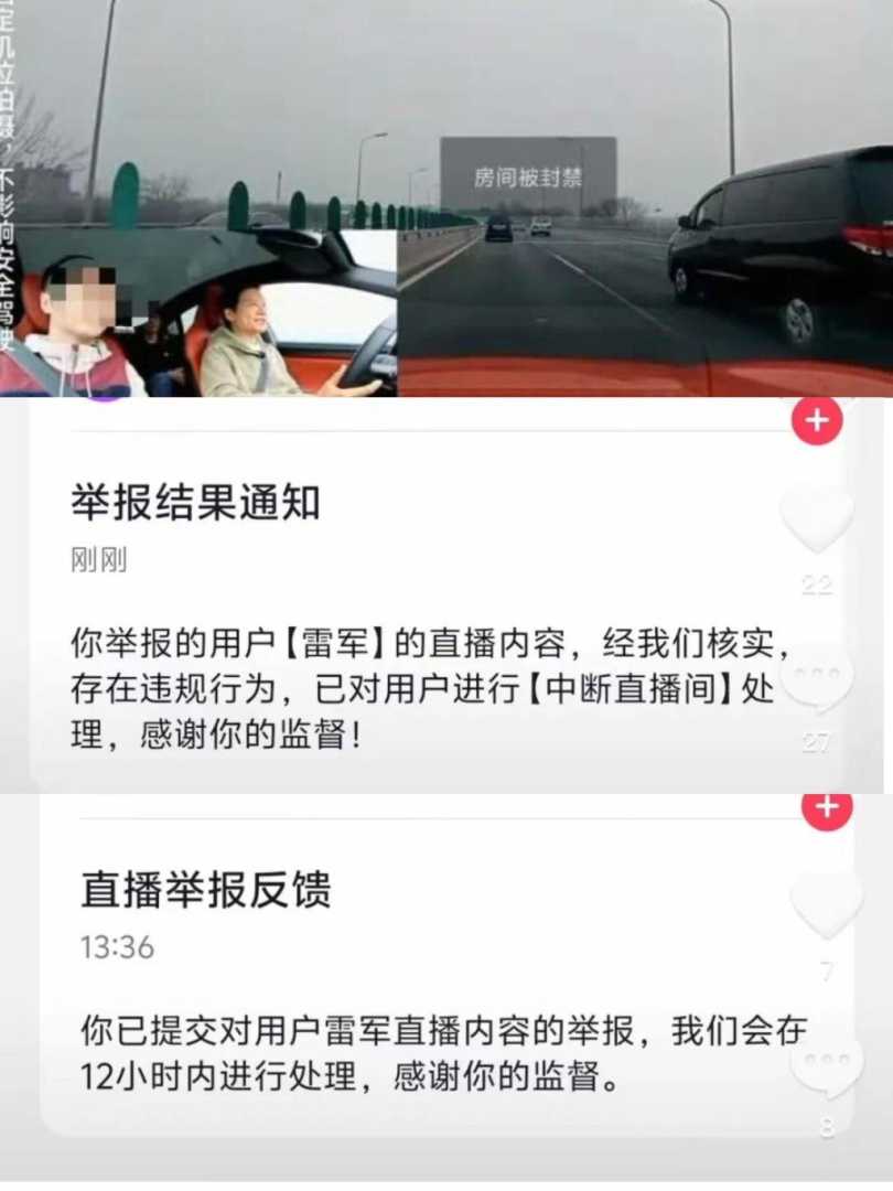 当天下午1点57分,网络上流传出一张名为“举报结果通知”的截图,内容显示:“您举报的用户【雷军】的直播内容,经平台核实存在违规行为,已对用户直播间进行【中断】处理,感谢您的监督!”