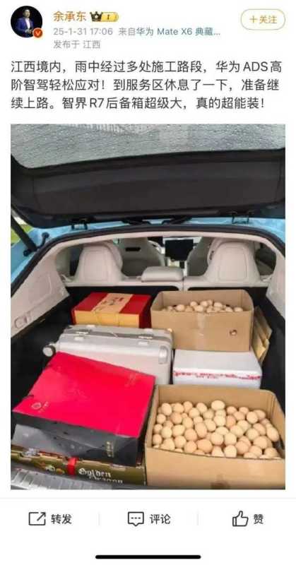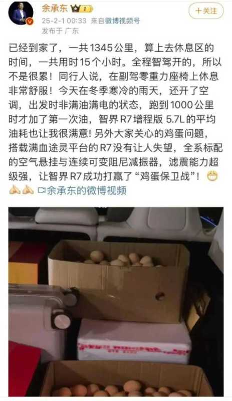2025年1月31日(大年初三),华为公司的重要人物——常务董事、终端BG董事长及智能汽车解决方案BU董事长余承东,自驾长达1343公里,从霍邱老家返回深圳,开启新一年的工作征程。在他的后备箱中,除了常规的行李,还特别装载了数百枚散装鸡蛋。余承东于2月1日凌晨通过社交媒体发文宣布顺利抵达深圳,整个自驾旅程耗时15个小时,全程采用了智能驾驶模式。对于公众关注的鸡蛋安全问题,他幽默地表示,自己成功打赢了这场“鸡蛋保卫战”。