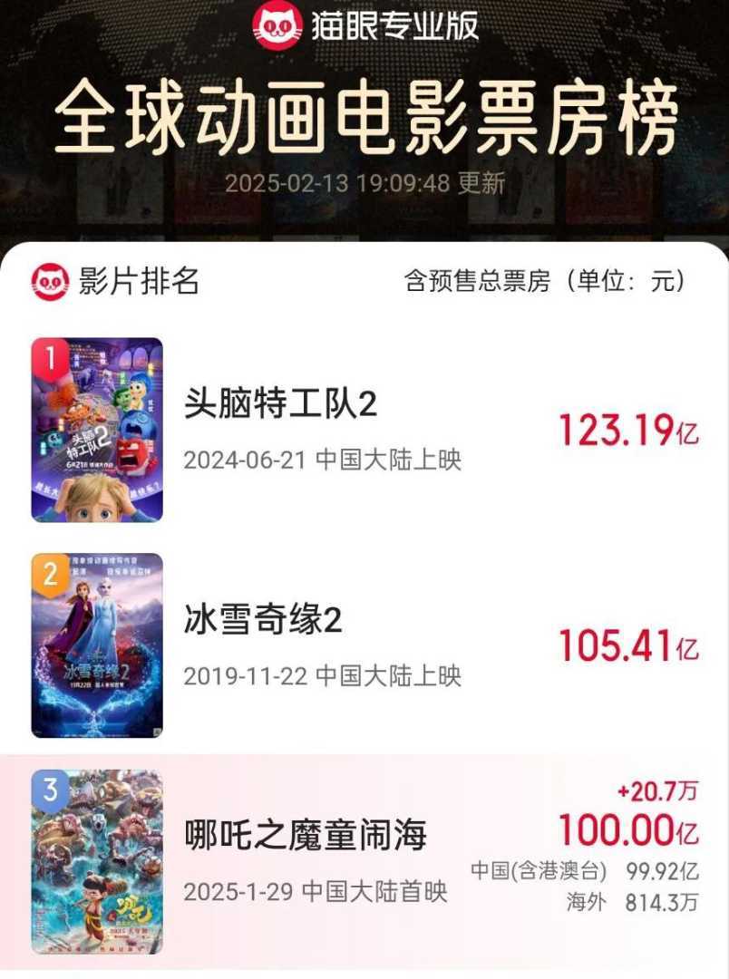 猫眼专业版数据显示,在《哪吒2》的票房成功达到100亿元后,其全球影视票房榜和全球动画电影票房榜的排名也分别冲上了第17名和第3名的高位。放眼全球,这也是首次有中国电影,乃至亚洲电影达到这一高度。