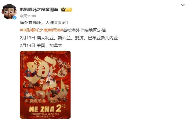 据“电影哪吒之魔童闹海”官方微博透露,该电影的首批海外上映地区已定档,包括2月13日的澳大利亚、新西兰、斐济、巴布亚新几内亚,以及2月14日的美国、加拿大等。