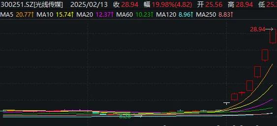 随着《哪吒2》票房突破100亿元,资本市场的相关上市公司表现同样被“引爆”。作为该影片的主投方和发行人,A股公司光线传媒的股价依旧处于狂飙状态。截至2月13日收盘,光线传媒股价上演了连续第4个“20cm”涨停,市值迅速突破800亿元,达到849亿元。相比节前最后一天不足280亿元的市值,其在节后7个交易日的累计增幅已达到夸张的204%。
