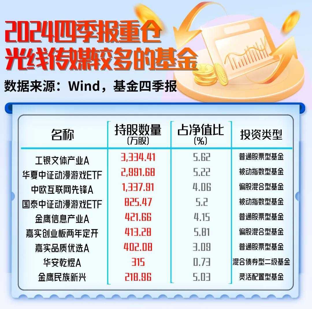 金融投资报记者注意到,不少持有光线传媒的投资者依然获得了不菲收益。以存在公开投资记录的公募基金为例,就有不少受益者可以从中发现。据最新一期公募基金季报及Wind统计数据,截至2024年四季度末,共有35只基金重仓持有光线传媒。